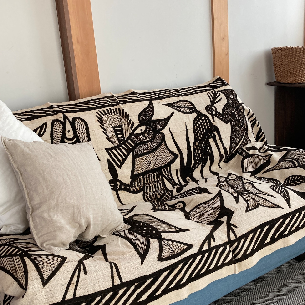 生地はざっくりとした中肉の厚みです。ベッドカバーやテーブルクロス、ソファや椅子にかけたり、 壁に飾ったりと、布一枚でお部屋の表情を変えてくれます。